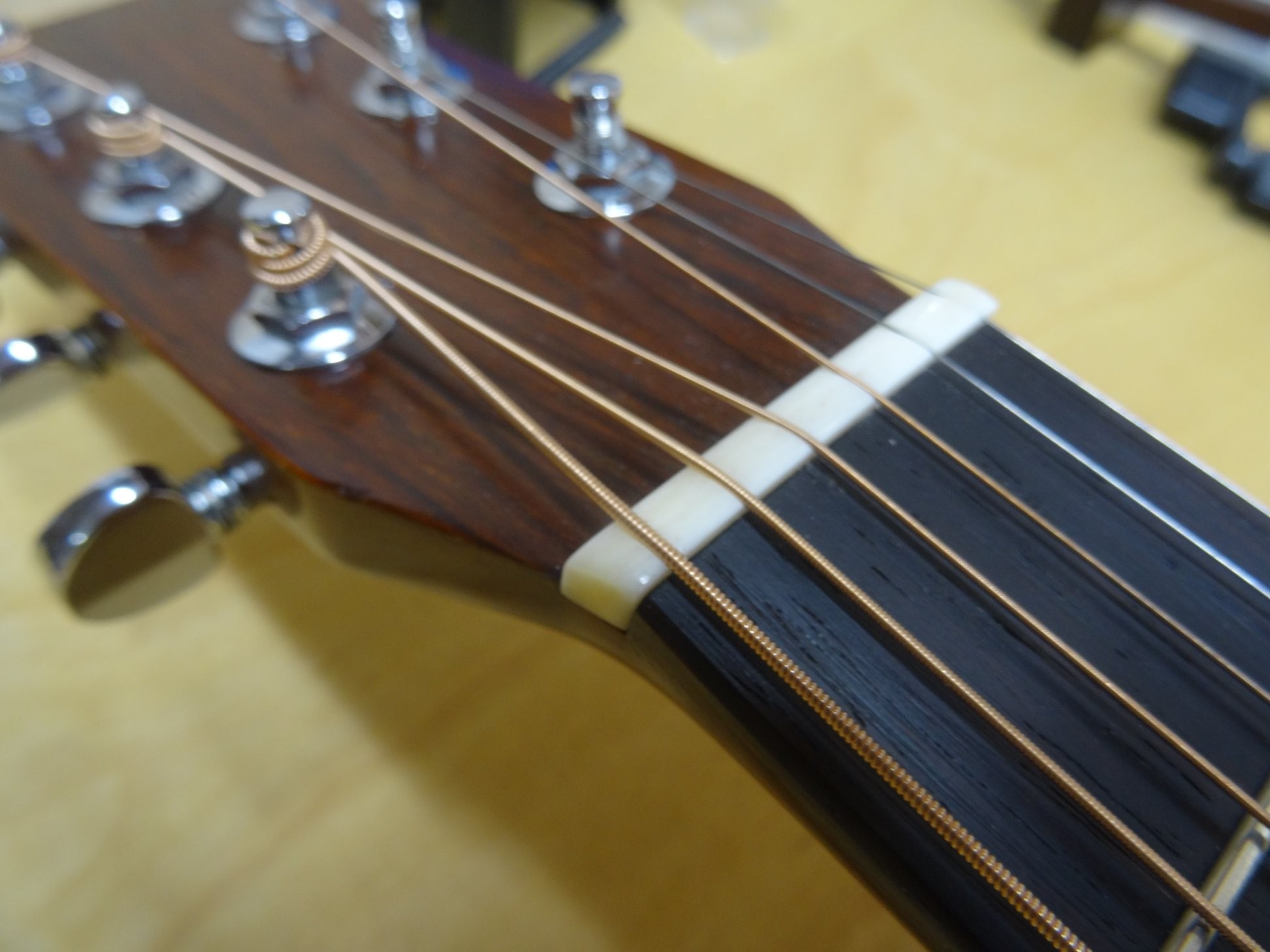 "Attention véritable petite bombe, cette guitare est à 2 doigts de faire passer chez l'ennemi votre serviteur, vieux Gibson sound addict depuis des années..... sans hésiter la meilleure Martin D18 que j'ai eu entre les mains ( voire meilleure Martin). La guitare, qui fut beaucoup jouée ( toujours bon signe ça !) nécessite quelques travaux afin de retrouver tout son potentiel. Dans l'ordre, nouvelle contreplaque, cette dernière avait certainement subi un début de décollement, ou quelqu'un avait tenté de la décoller sans succès et par conséquent avait injecté une colle non réversible abandonnant donc l'intervention. Il me faudra plus de 3 heures pour la retirer sans dégâts. Ensuite le manche sera ôté afin de modifier le renversement et de retrouver une jouabilité confortable, petite câle en sillet invisible afin de remonter le bas de touche et de procéder à un collage nickel, refrettage en frettes fines, quasi identiques aux originales, nouveau sillet en os, a la fois en chevalet et en tête achèveront le travail. Fente de dos sécurisée, mais stable depuis de nombreuses années. Hormis le fait que la guitare a retrouvé un confort de jeu top, le son est exceptionnel, dynamique, équilibré, un poil de crispant ( juste ce qu'il faut ), des basses terribles, mais les aigus ne sont pas en reste, même si on peut préférer une D28 pour du bluegrass, celle ci n'est pas en reste et se prête au jeu la tête haute. 1967 est une année de transition chez Martin, les vernis vont progressivement s'épaissir, mais surtout des détails comme la mise en oeuvre de la contreplaque ( coeur de la guitare) vont changer, la taille reste identique mais le palissandre remplace l'érable ( sur celle ci elle était encore en érable, et je l'ai changé à l'identique), et progressivement cette pièce s'élargira considérablement au détriment du son à mon avis. On est encore en présence également d'un truss rod non ajustable au profil en T, et non pas le tube carré mis en service par la suite, et encore une fois ce n'est que mon opinion, mais ce truss est moins efficace et influençent le son, pas forcément pour le meilleur. Ce modèle de 67 fait donc partie des dernières Martin Old school, dans la conception, ce qui explique certainement sa qualité sonore exceptionnelle."
